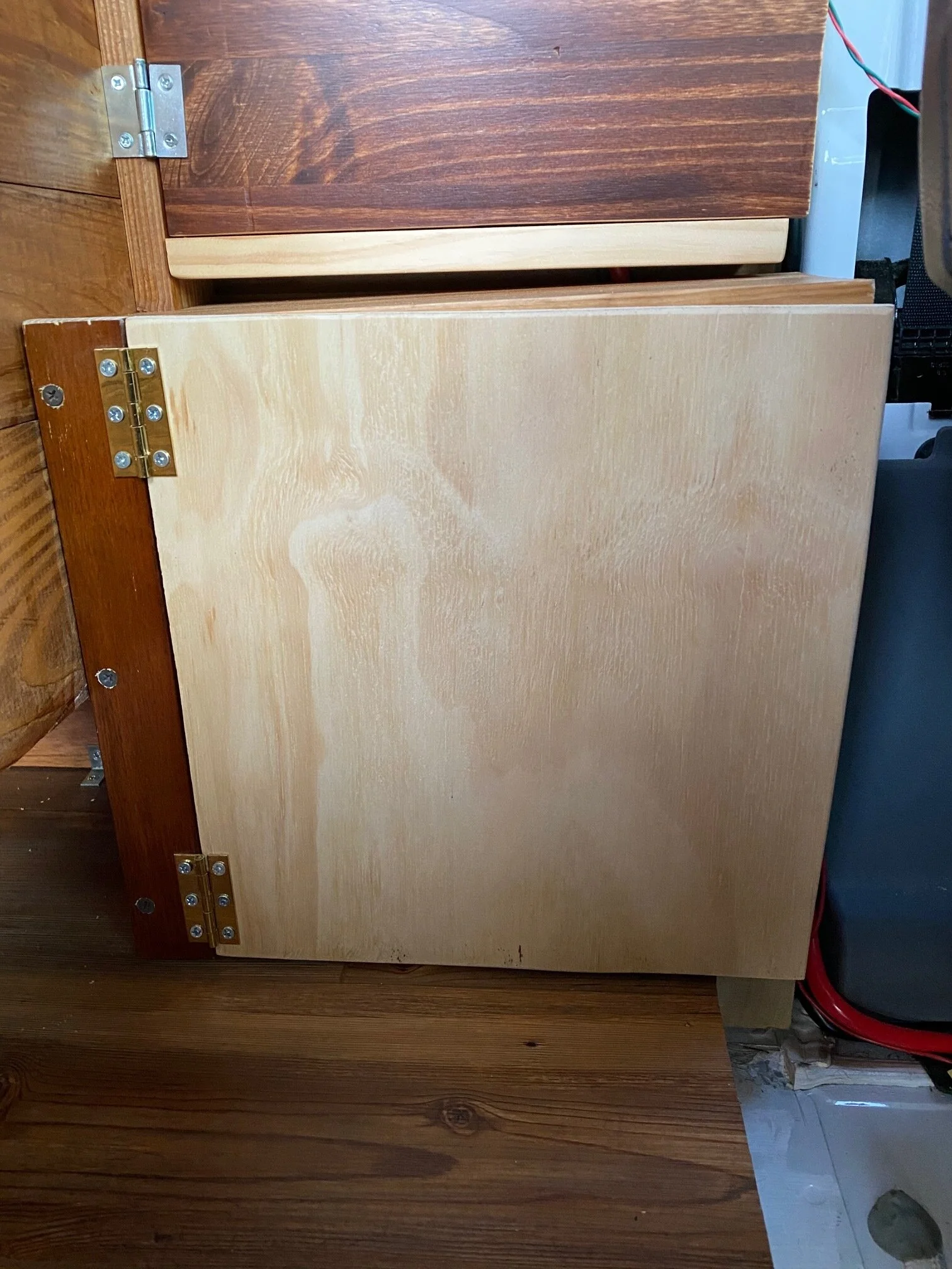 The Cyrix has to go between both batteries, and the battery monitor attaches with a big nut in the back, so you need to put it somewhere that you can get behind it. Fortunately Doug had installed a couple of floating panels here so we could use this space as a “smuggler’s hold.” Guess we’ll have to find a new place to hide all our drugs! (Just kidding, Ma.)